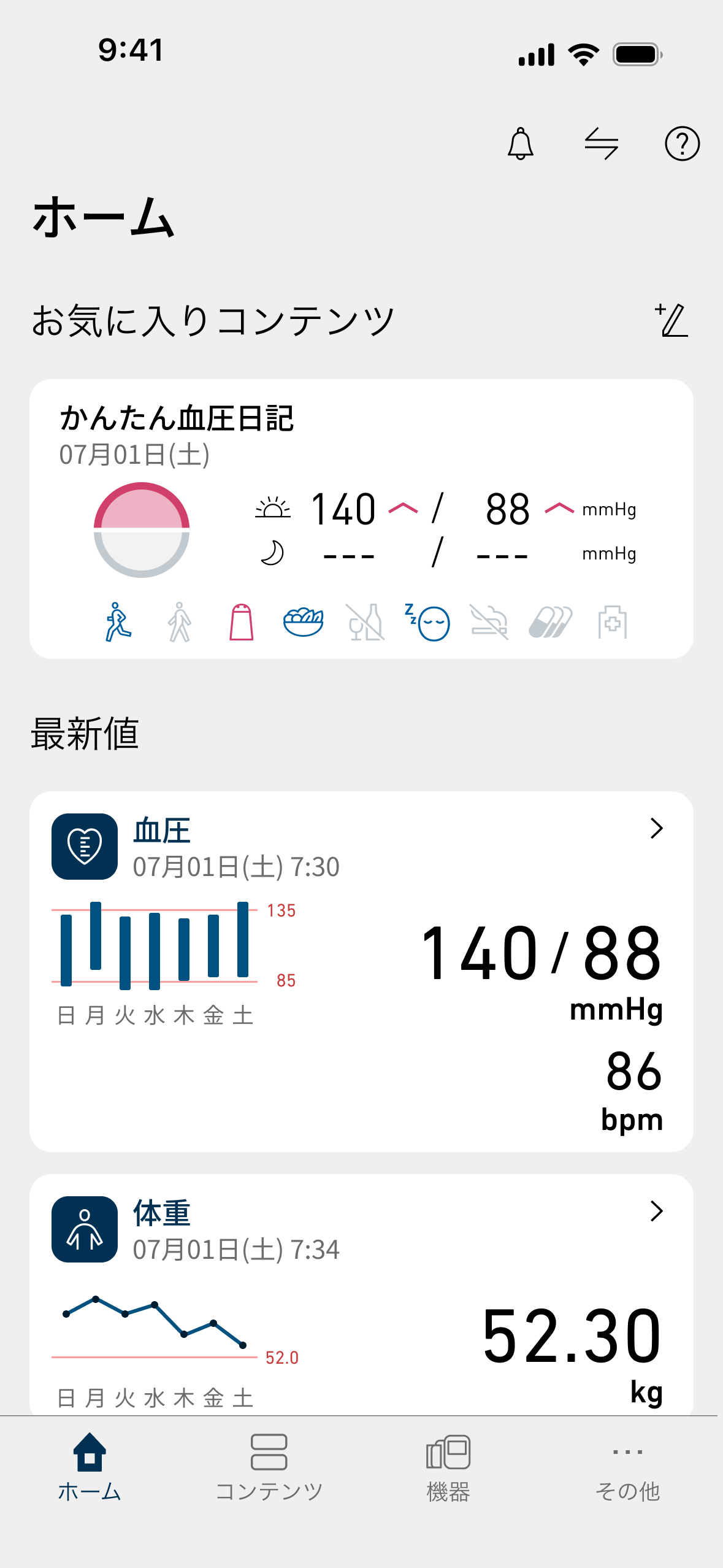通信機能付き血圧計や体重体組成計で測定したデータを、グラフやカレンダーで確認することができる健康管理アプリ。「かんたん血圧日記」や「かんたん朝晩ダイエット」など健康管理に役立つ機能を搭載している。